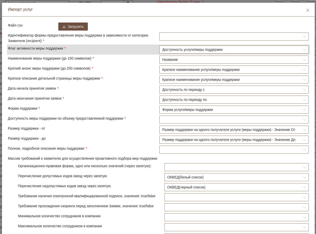 После загрузки файла система предложит связать поля для услуги МСП с колонками в CSV файле. Часть полей будет предустановлена автоматически. Предустановленные поля можно изменить при необходимости.