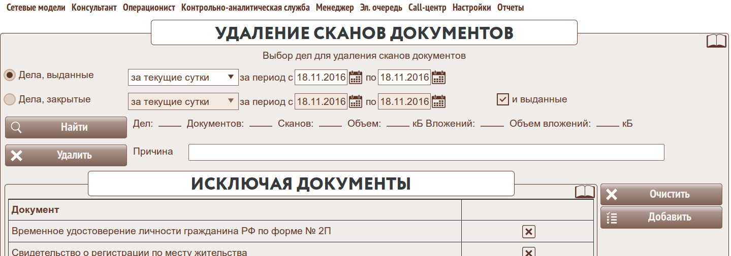 Форма предназначена для удаления из базы данных ИИС сканов документов и вложений в дела.