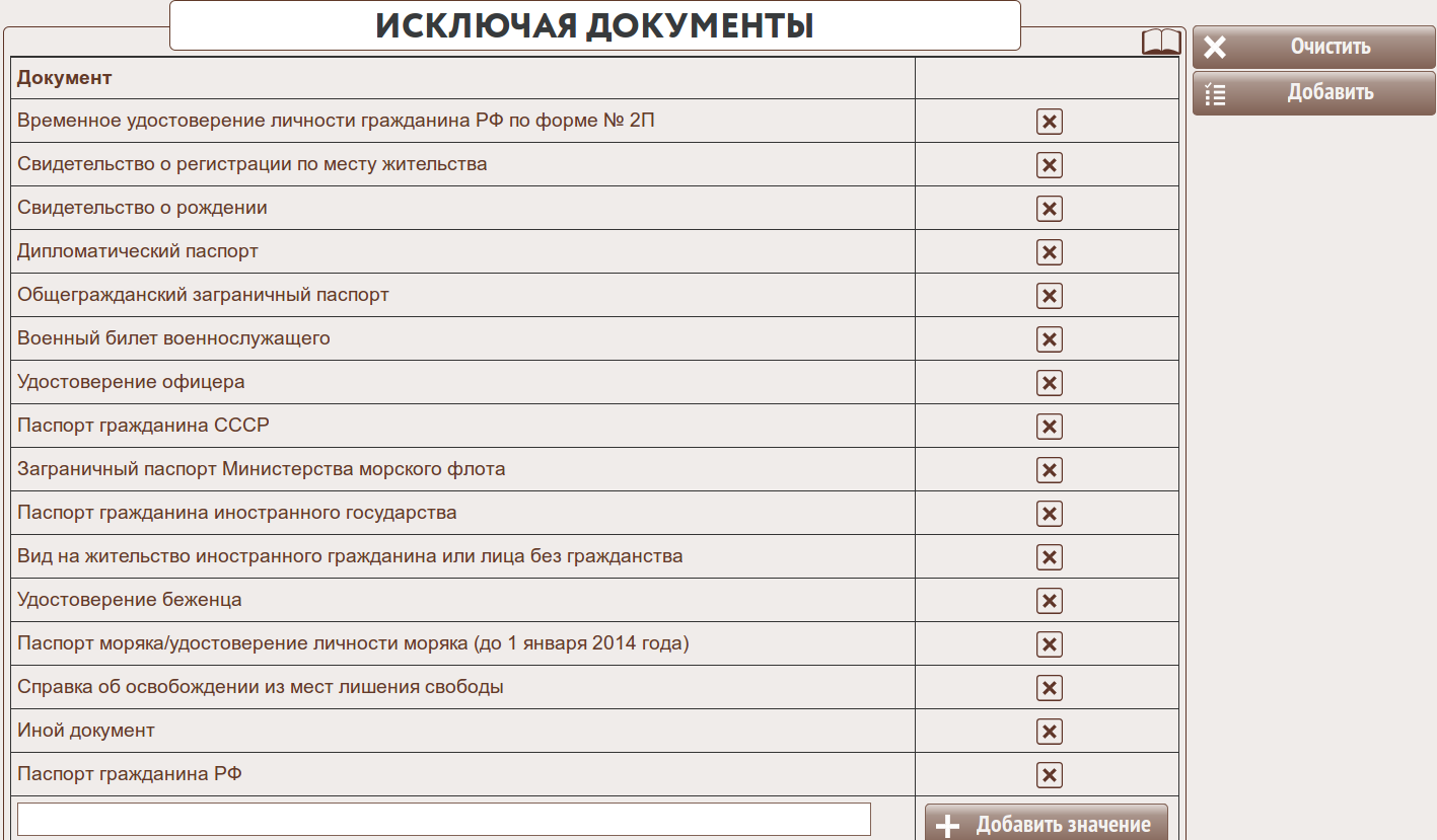 добавляет в список перечень ДОКУМЕНТОВ, УДОСТОВЕРЯЮЩИХ ЛИЧНОСТЬ.