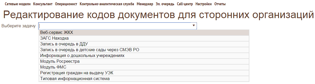 В ИИС МФЦ есть набор задач для интеграции. Каждая задача предназначена для связывания кодов документов ИИС МФЦ и ведомственных систем. Сначала необходимо выбрать задачу с которой будем работать.