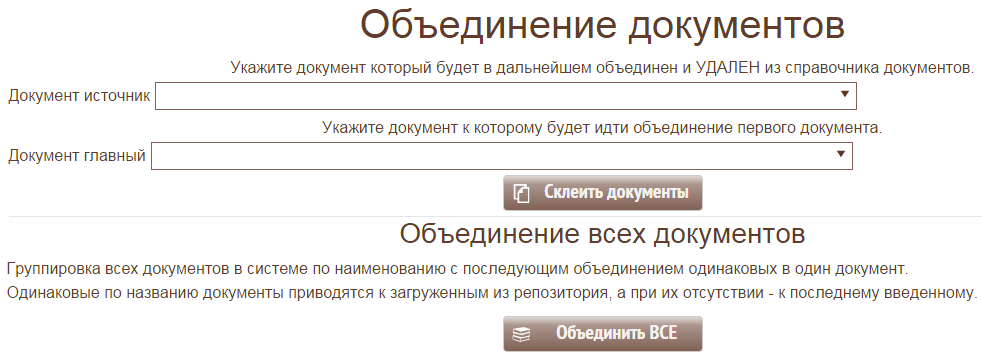 Существует возможность объединенения документов путем склеивания их в один экземпляр. При этом происходит перенос всех зависимостей удаляемого документа на идентификатор нового. Эта возможность позволяет навести порядок среди документов, убрав их дубликаты.