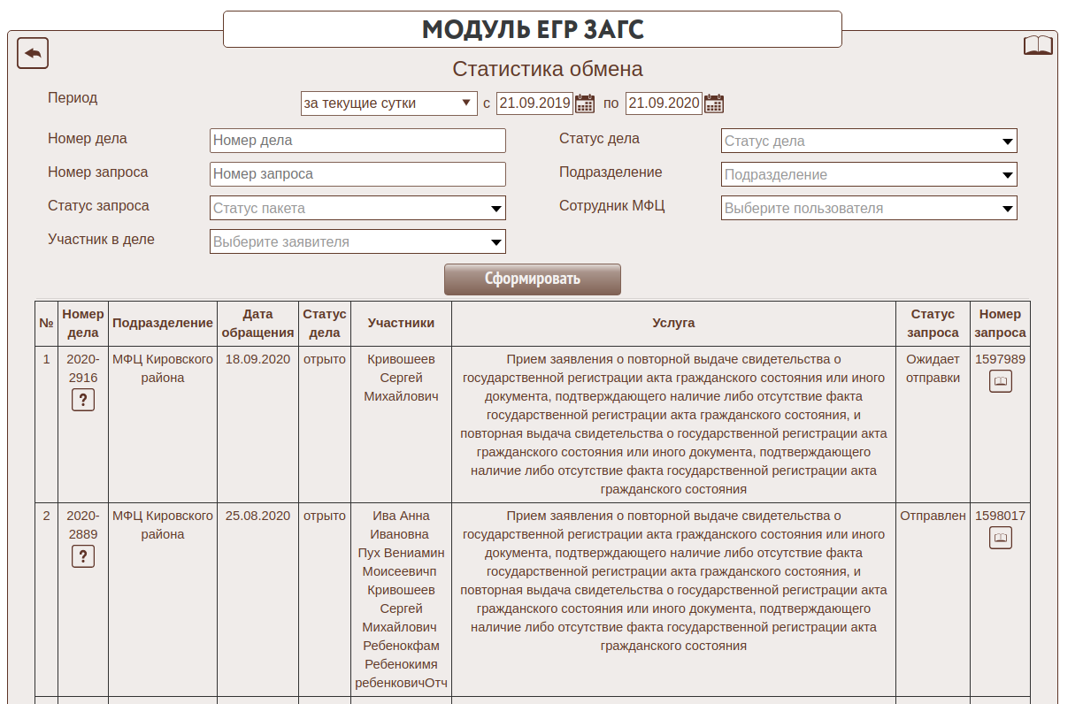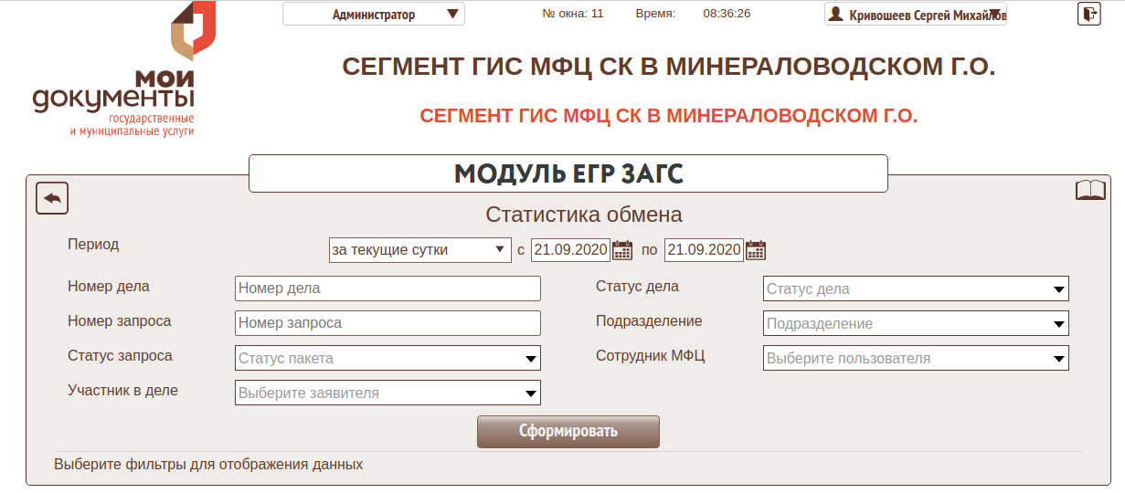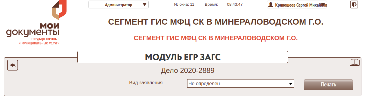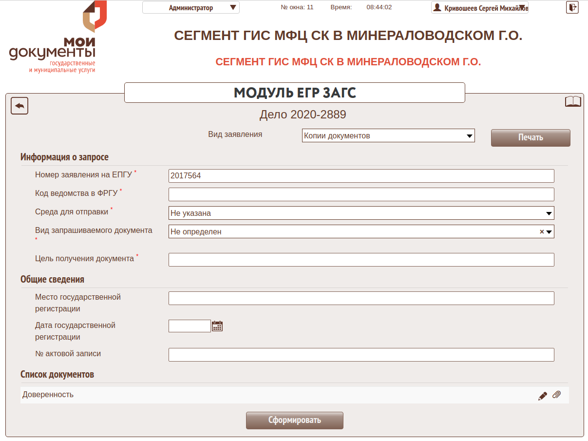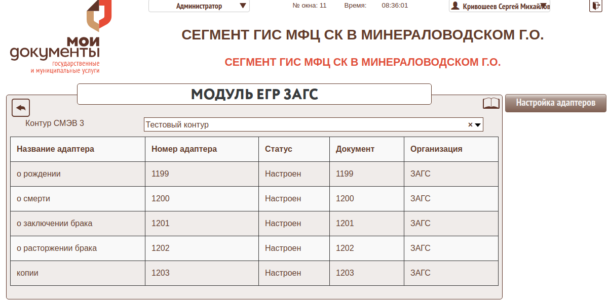 После прохождения опросника, оператор переходит в модуль ЕГР ЗАГС. Ему доступен выбор адаптера, в рамках которого будет формироваться запрос в орган.
