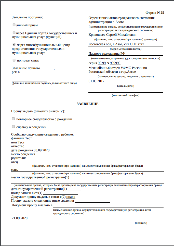 В зависимости от указанных данных в заявлении будет доступна печать заявления по услуге.