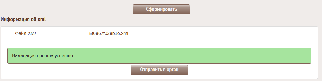 После заполнения формы необходимо произвести формирование ХМЛ файла, для проверки корректности введенных данных. Если при валидации возникнут проблемы, то будет выведено соответствующее сообщение.