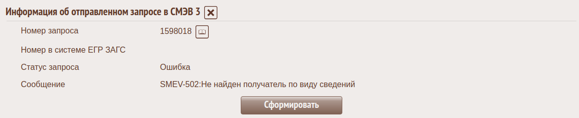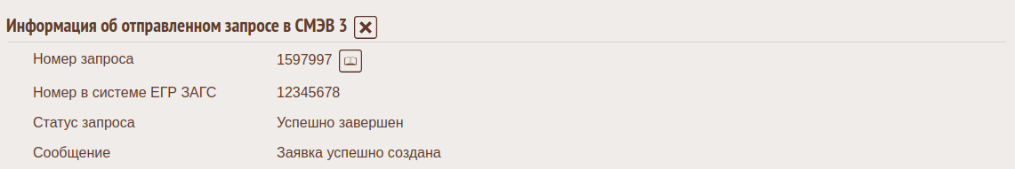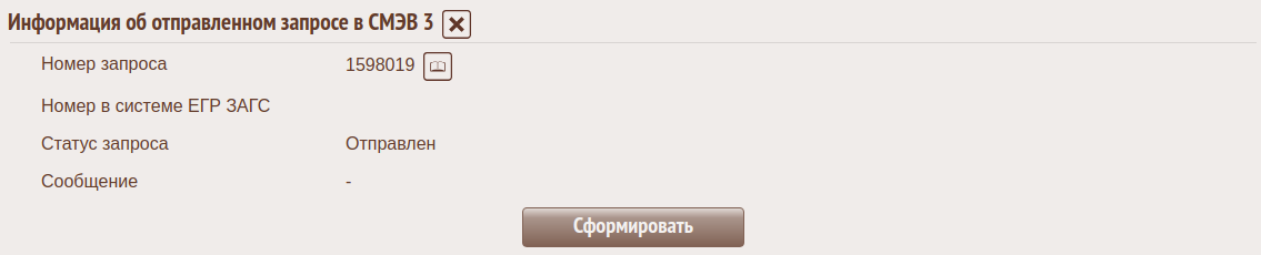После успешной валидации появится возможность отправить запрос в орган власти. Отправление запроса будет производиться через адаптеры в СМЭВ 3. После отправления запроса будет выведена информация о номере запроса и статусе. После отправления запроса все поля будут заблокированы в модуле.