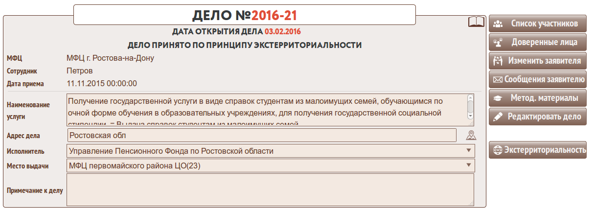 Если дело принято по экстерриториальности в карточке дела будет указана информация о МФЦ и сотруднике, который открыл дело.