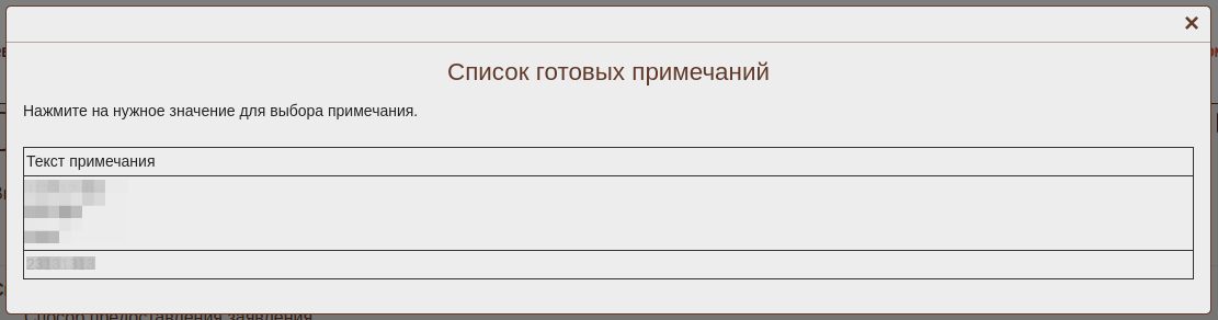 На вкладке "Получение и доставка" рядом с полем Примечание (заполняется специалистом, осуществляющим прием запроса, при наличии дополнительной информации) добавлена иконка "Вставить примечание из шаблона". При нажатии на эту кнопку будет открыто модальное окно со списком доступных примечаний