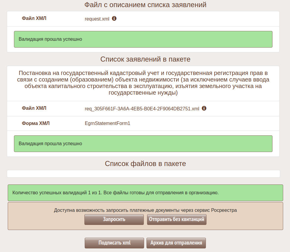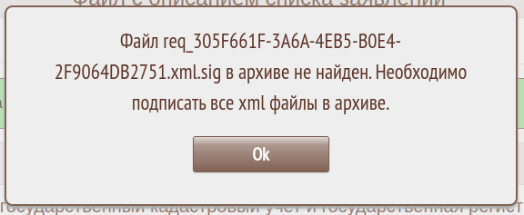 При формировании архива для отправления произойдет проверка всех файлов XML и подписей для них. Если все файлы подписаны произойдет отправление пакета с заявлением. Если один из файлов не подписан будет выведено уведомление с информацией какой файл без подписи