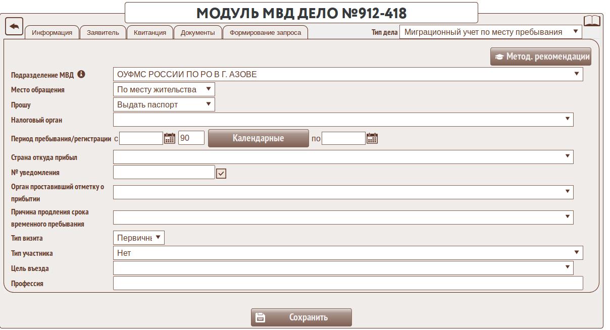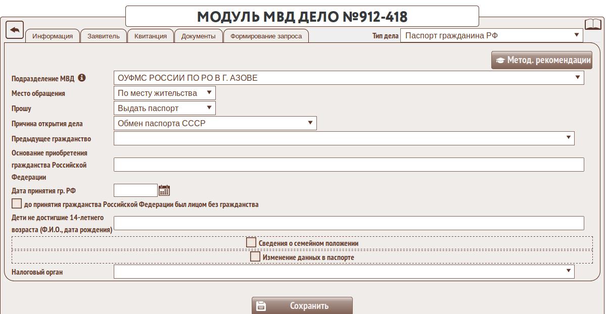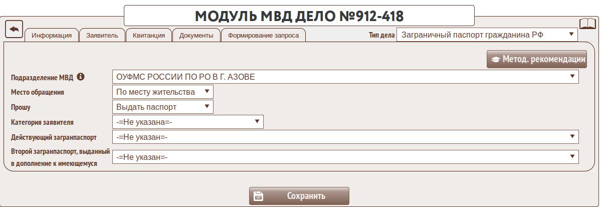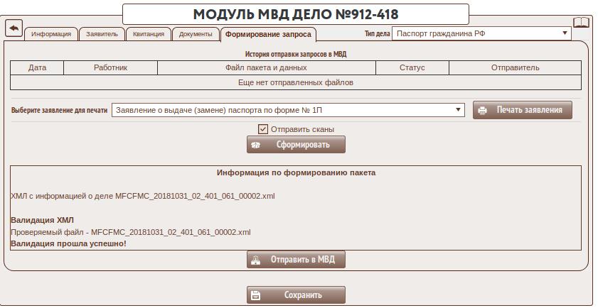 Для оказания услуг МВД на базе МФЦ создан специализированный модуль позволяющий формировать пакет документов и выгружать XML в ППО Территория.
