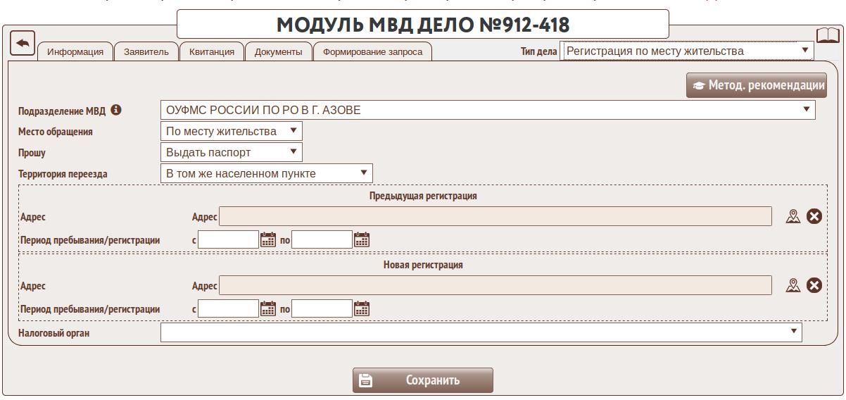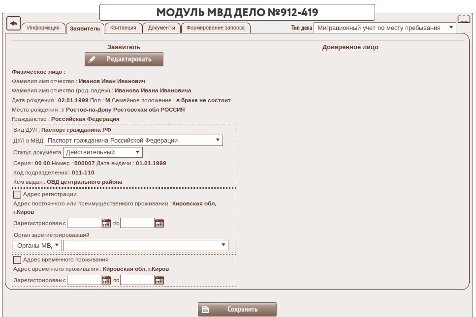 В информации заявителя необходимо проверить правильность заполнения всех реквизитов. Указать орган зарегистрировавший заявителя и документ удостоверяющий личность. В карточке заявителя есть краткий список документов удостоверяющих личность. Для работы модуля МВД необходимо уточнить документ удостоверяющий личность для правильной идентификации заявителя в ППО Территория.