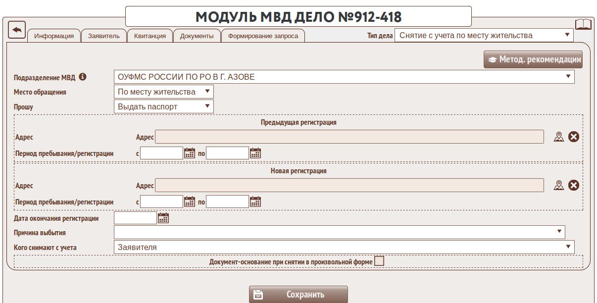 Для снятия с учета по месту жительства необходимо указать дату окончания регистрации (по текущему месту жительства), адрес выбытия (куда выбыл после снятия с учета по месту жительства), период пребывания (куда выбыл), причину выбытия, кого снимают с учета и документ основание при снятие с учета