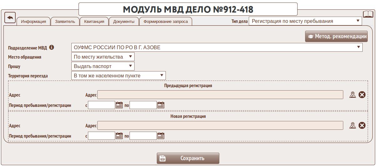 Для регистрации по месту жительства необходимо указать место обращения, адрес места жительства (откуда прибыл заявитель), Период пребывания/регистрации