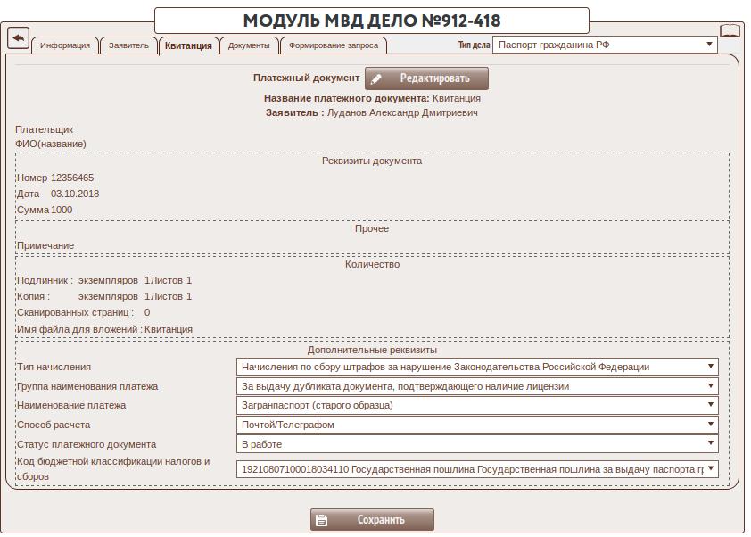 Если в услуге участвует платежный документ (государственная пошлина), необходимо дополнительно указать ряд реквизитов для документа : тип начисления, наименование платежа, способ расчета, статус платежного документа и КБК налогов и сборов.