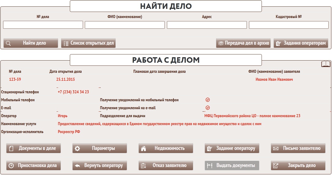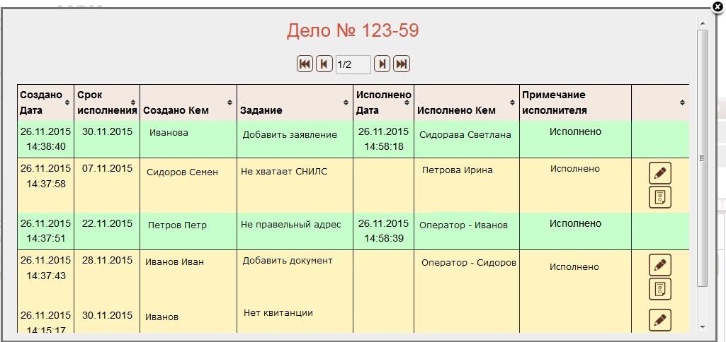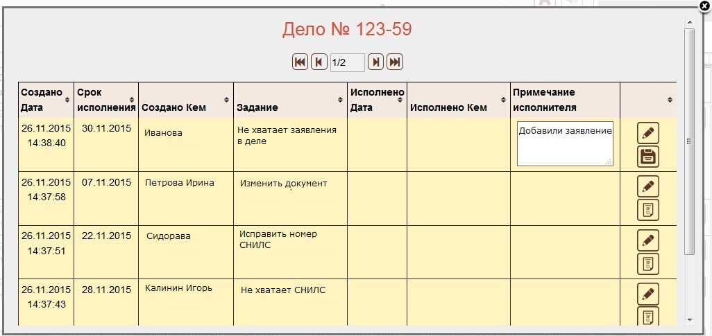При открытии документов в деле оператор увидит полный список документов в деле с возможностью их редактирования. После внесения необходимых изменений в дело оператор должен поставить отметку об исполнении.