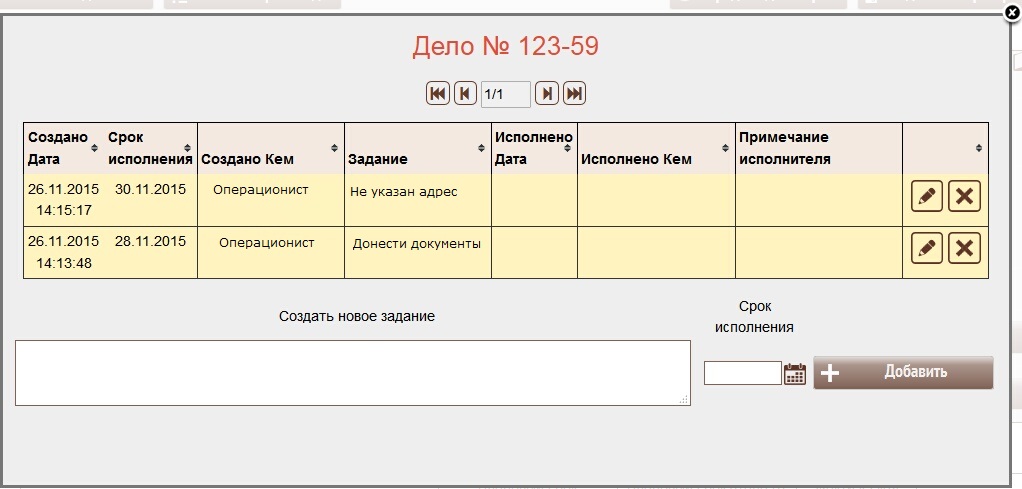 Откроется модальная форма в которой можно увидеть список всех заданий по данному делу. Если работнику КАС необходимо создать новое задание для опреациониста ему нужно указать текст задания и срок исполнения (если задание имеет сроки) нажать кнопку