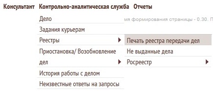Переход в меню "Реестры" -> "Реестры передачи дел" нажимаем на