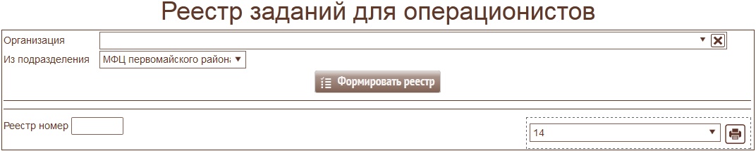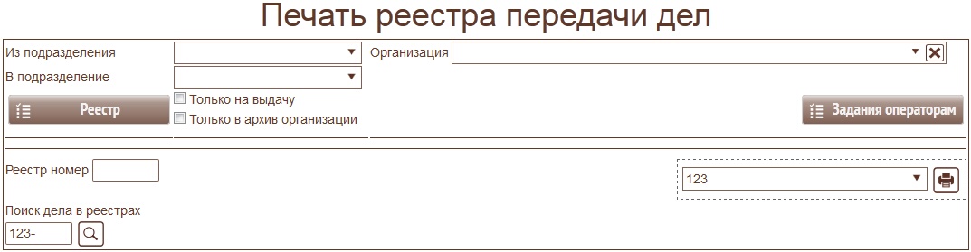 Для печати реестра выданных заданий для опреационистов необходимо зайти в меню "Реестры"-"Реестры передачи дел"
