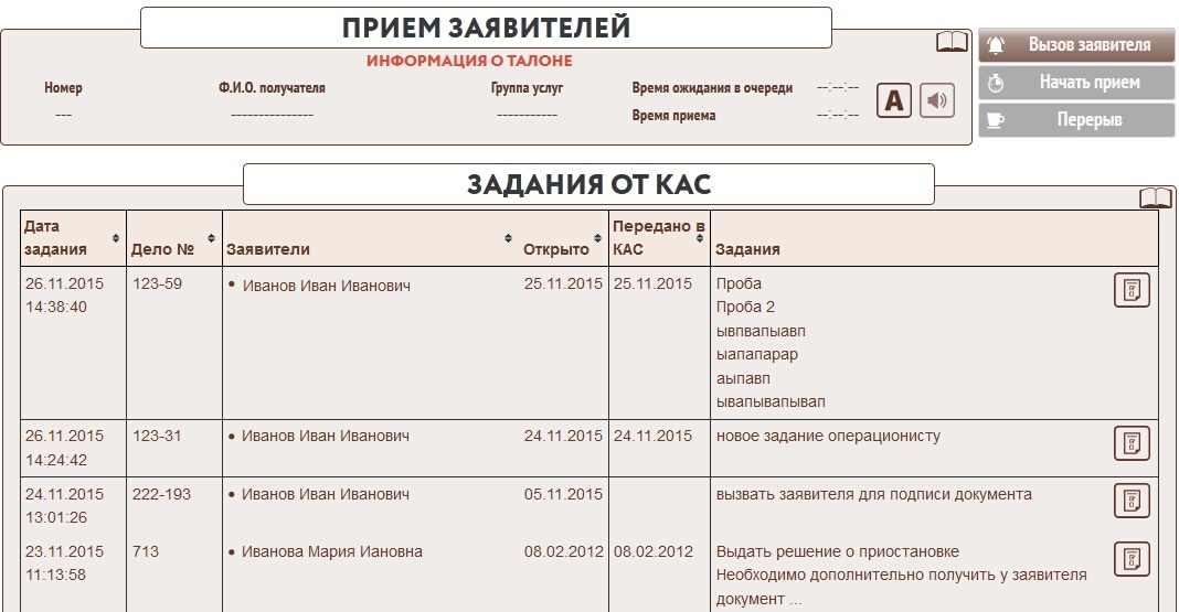 Работник КАС может контролировать процесс выполнения заданий. Для этого нужно нажать на кнопку "Задания операционистам"