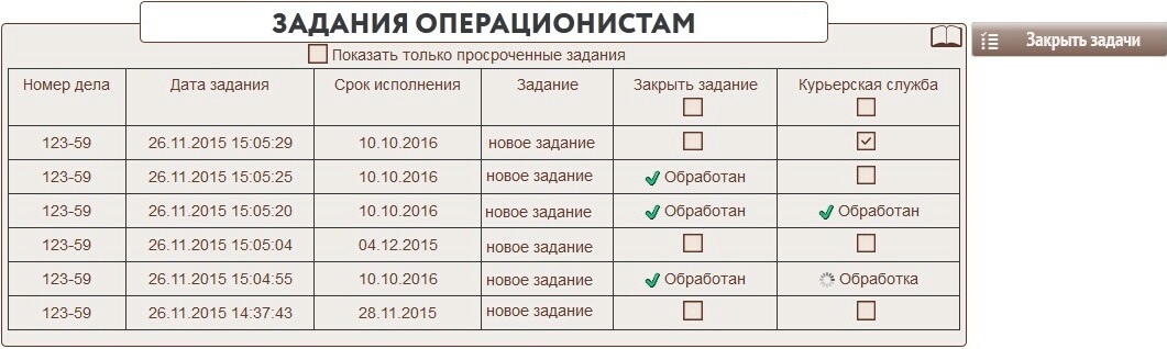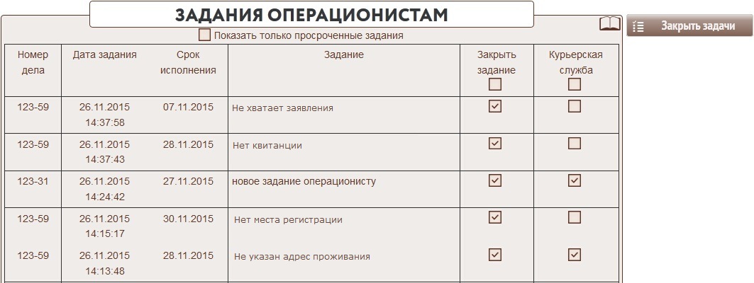 Будет открыта форма со списком всех открытых задач. Если у задачи был указан срок исполнения можно отсортировать просроченные задачи (опция "Показать только просроченные задачи"). Работник КАС может выбрать задания которые необходимо закрыть. Так же можно указать у закрываемых задач необходимость формирования реестра курьеров для этого дела. Курьерская служба необходима если задание было выдано для выдачи промежуточных результатов (решение о приостановке и т.п.) и не выданные результаты необходимо вернуть в организацию исполнитель.