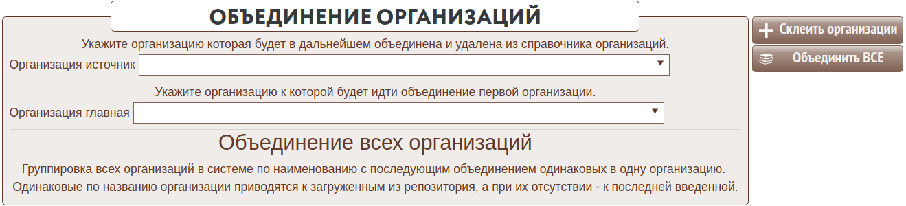 Существует возможность объединенения организаций путем склеивания их в один экземпляр. При этом происходит перенос всех зависимостей удаляемой организации на идентификатор новой. Эта возможность позволяет навести порядок среди организаций, убрав их дубликаты.