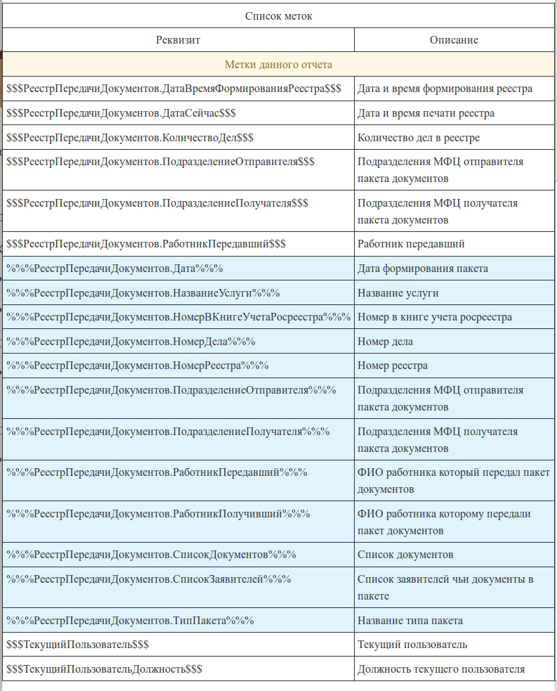 Для каждого бланка существует свой набор меток
