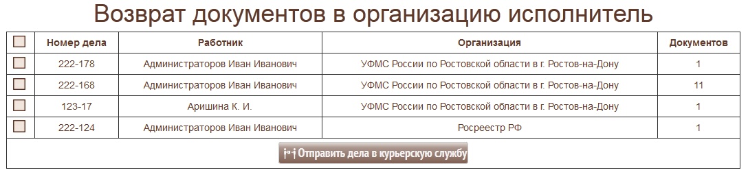 Откроется форма со списком дел для возврата. Выберите необходимые дела и нажмите кнопку "Отправить дела в курьерскую службу"
