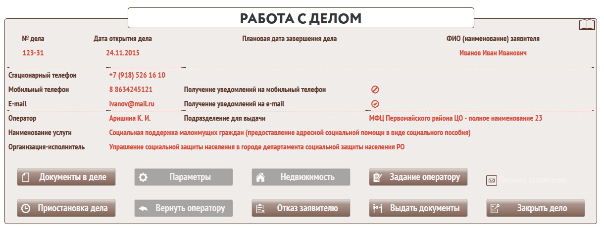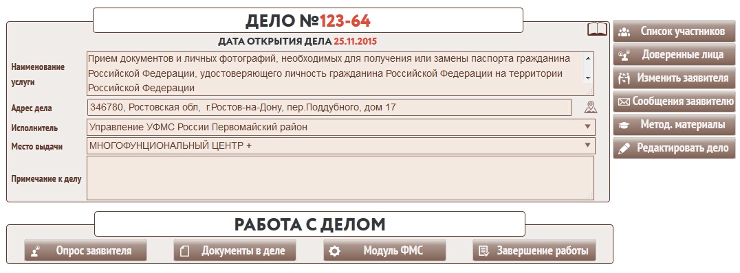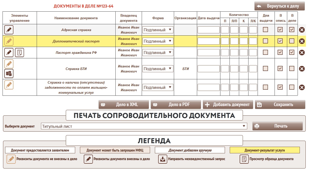 Сотрудник продолжает работать с этим делом. Если возникает необходимость выдать пакет документов заявителю, сотрудник может сформировать его нажав кнопку в форме работы с делом.