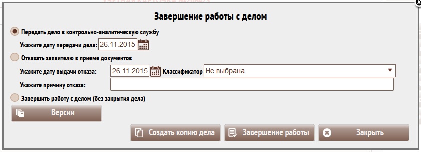 20. Когда дело было закрыто в КАС и выданы все пакеты документов по делу можно закрыть дело на выдаче (работа с делом завершена).
