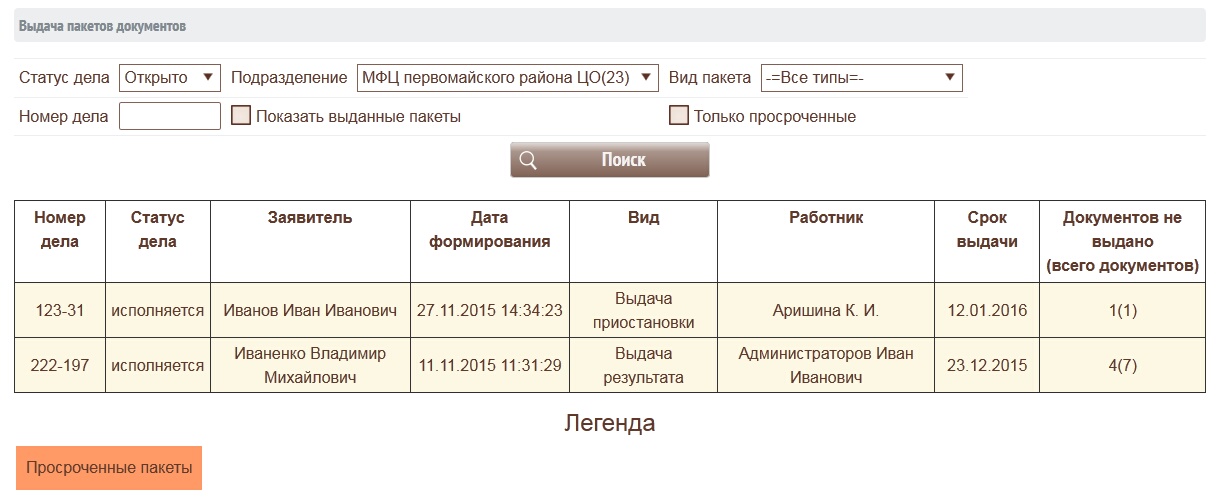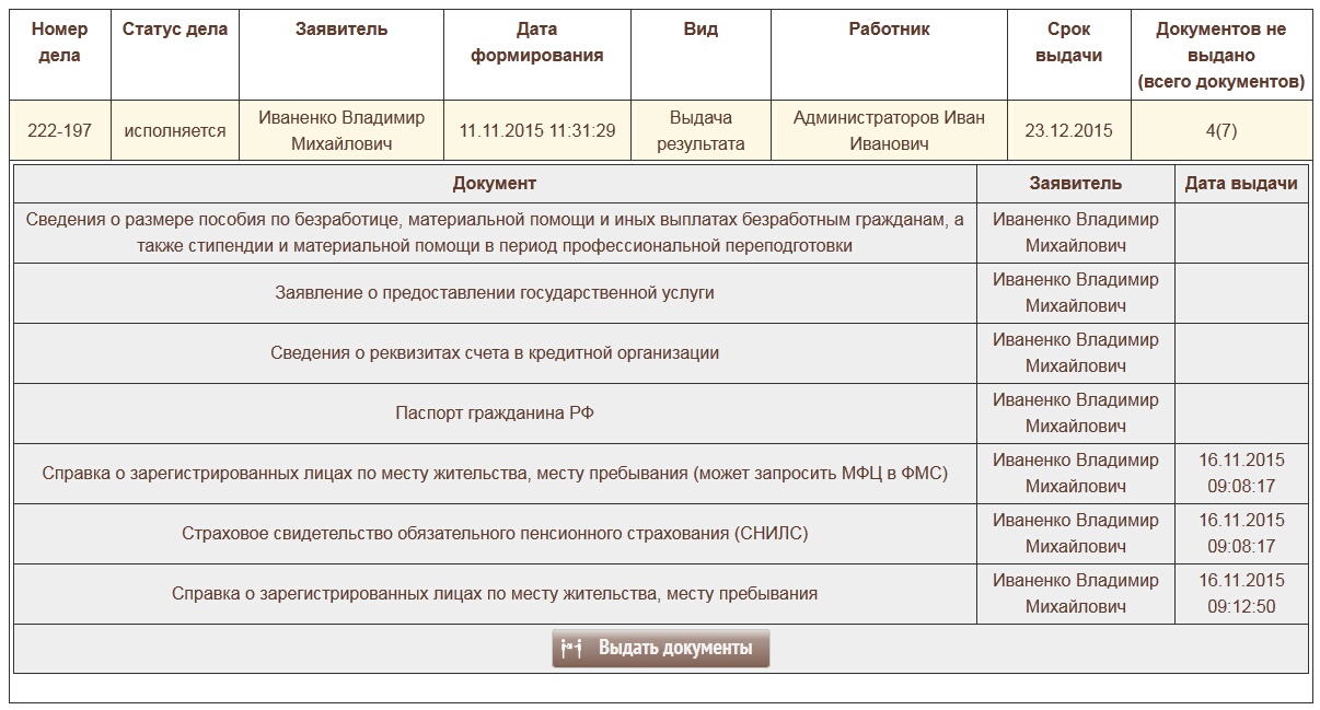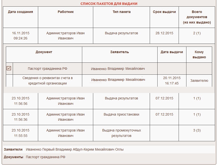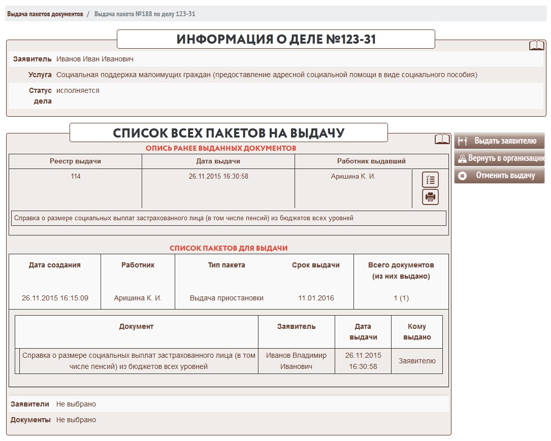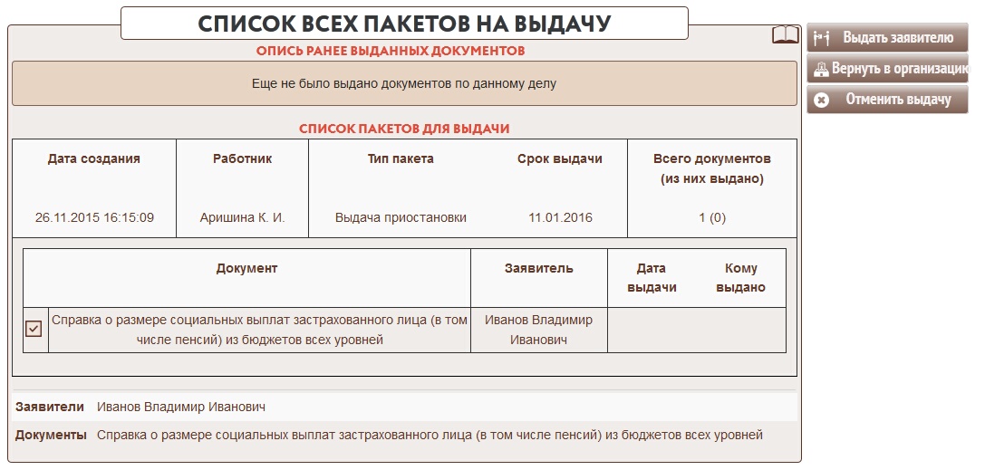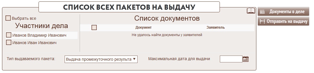 18. Пакет документов может быть выдан не полностью. К примеру если в пакете указаны двое или более участников дела. Если документ уже был выдан и возвращен об этом будет видно в списке документов для выдачи.