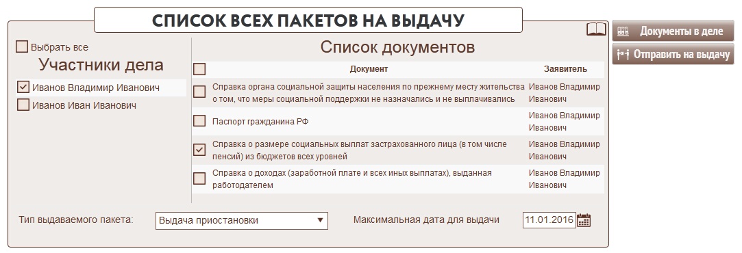 10. Далее сотрудник КАС выбирает участников дела и указывает какие документы будут выданы. Можно указать максимальную дату для выдачи пакета. Этот параметр позволит информировать оператора на выдаче о необхоидмости возврата дела в организацию, если заявитель не явился за результатом.