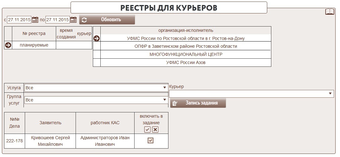 При возврате не выданных документов в организацию работнику КАС необходимо сформировать задания курьерам. Для этого необходимо нажать кнопку