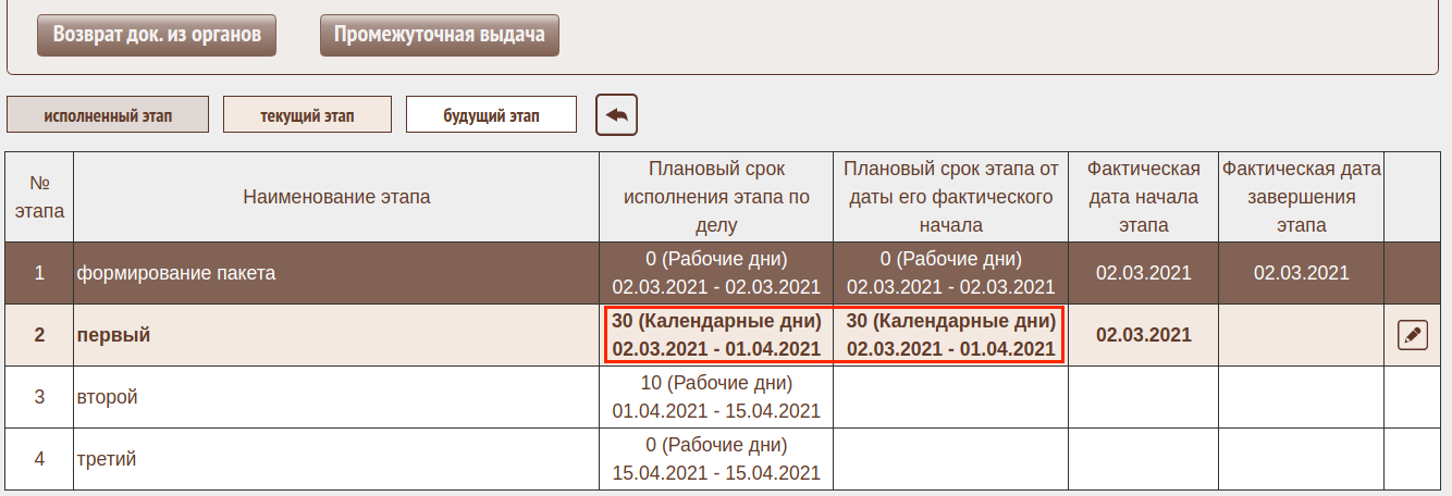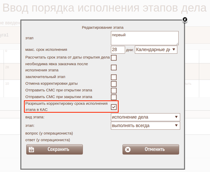 Для этого необходимо в паспорте услуги, в форме "Порядок исполнения этапов дела" у этапа, который может изменится, установить опцию Разрешить корректировку срока исполнения этапа в КАС