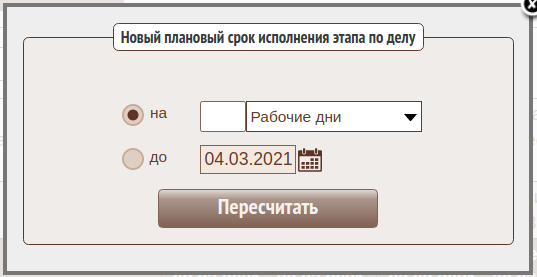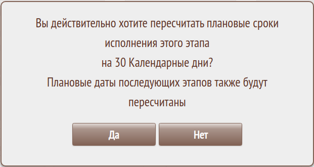 Здесь нужно указать новый срок исполнения этапа: или на определенное количество дней (месяцев), или до определенной даты.