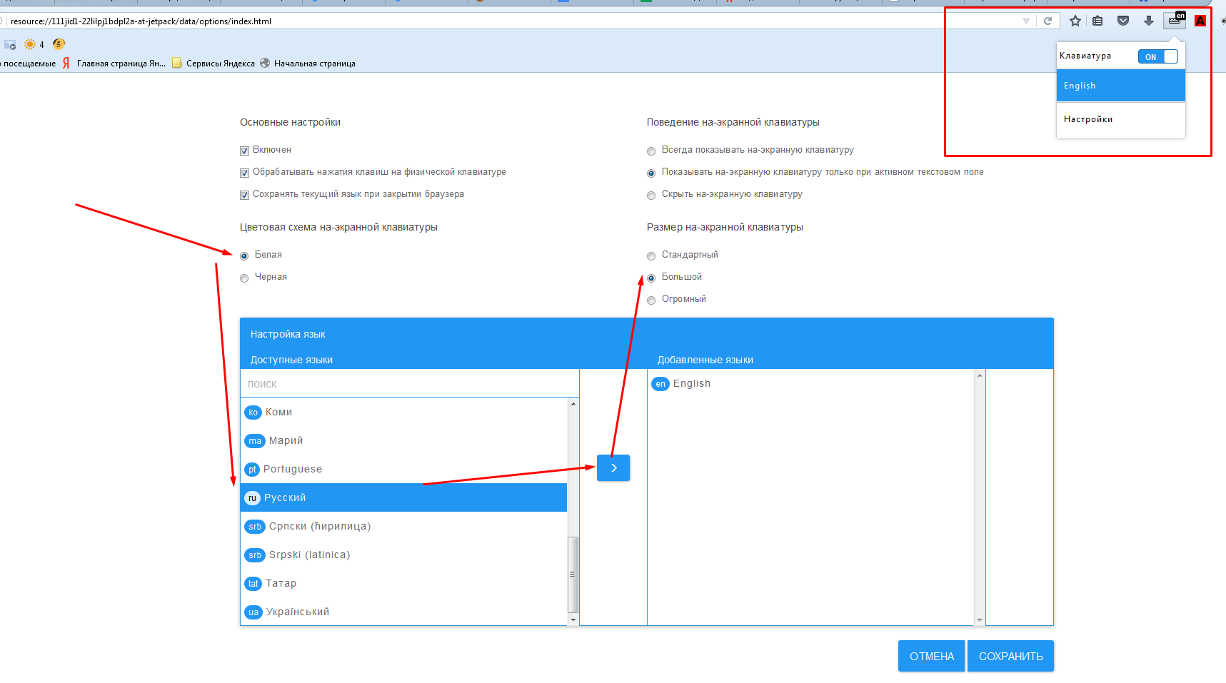В форме настроек нужно заменить язык на русский, поведение - показывать только при активном текстовом поле, размер - большой, цветовая схема - белая.