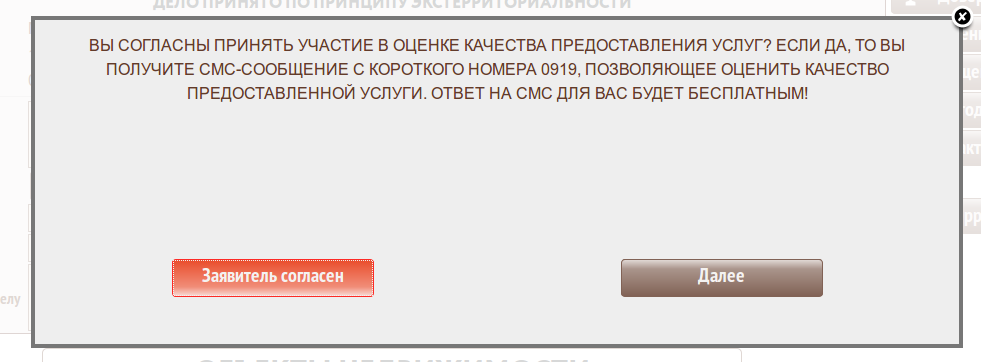 Если услуга участвует в СМС опросе будет выведено сообщение с возможностью указать кому из заявителей будет отправлено СМС сообщение