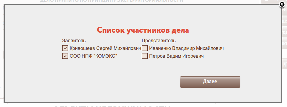 Если нажать "Далее" данный этап будет пропущен и начнется опрос заявителей по делу.