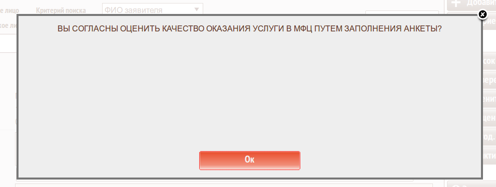 После всех настроек на инфокиоске появится новая кнопка "Оценить качество услуг". Выбрав ее Вы должны указать номер закрытого дела и фамилию. Если данные найдены то автоматически перейдете на прохождение опроса.