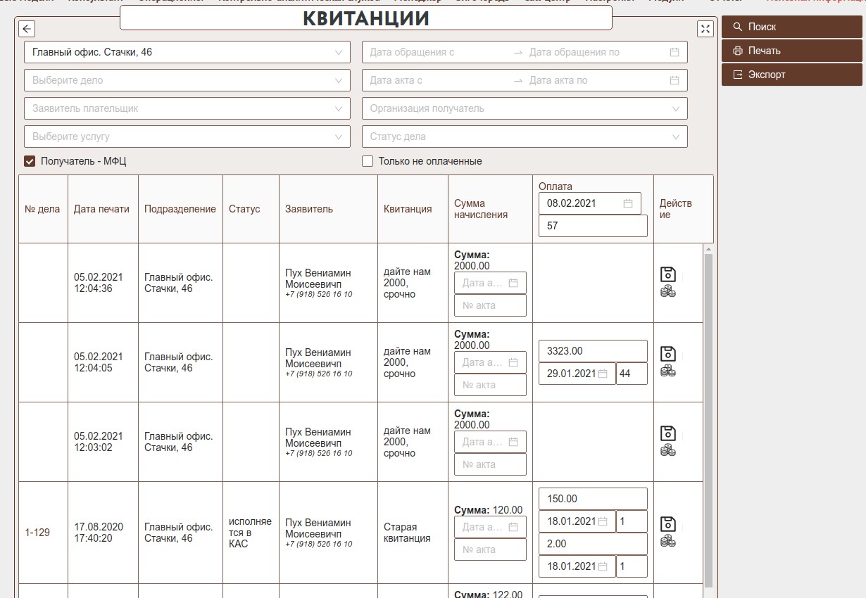Принцип работы с формой таков: с помощью фильтров выбираются квитанции в которых необходимо установить факт оплаты, в колонка "сумма начисления" выведена сумма начисления указанная при печати квитианции и поля для ввода даты и номера акта. К в колонке "Оплата" необходимо ввести сумму, дату оплаты и номер реестра в рамках которого вносится оплата. В шапке таблицы в колонке "оплата" можно указать дату и номер реестра по-умочанию, этими данными будут запоняться дата и номер реестра в ячейках таблицы при нажатии к кнопки "Заполнить платеж" Реестр это группировка оплат, так как оплаты обычно разносятся работником МФЦ в соответствии с реестром переданным из банка, казначейства, бухгалтерии и т.п. Либо импортируются списком, также по принципу реестров.
