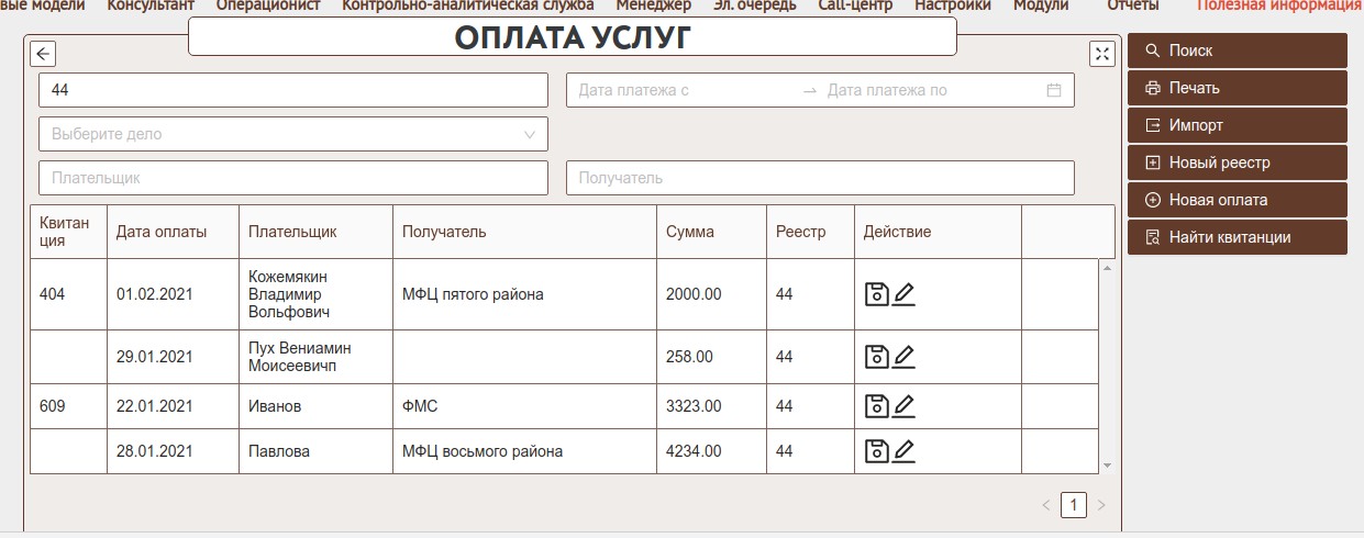 -реестр - реестр списка оплат по которому необходимо выбрать информацию, при добавлении оплаты - реестр по умолчанию.