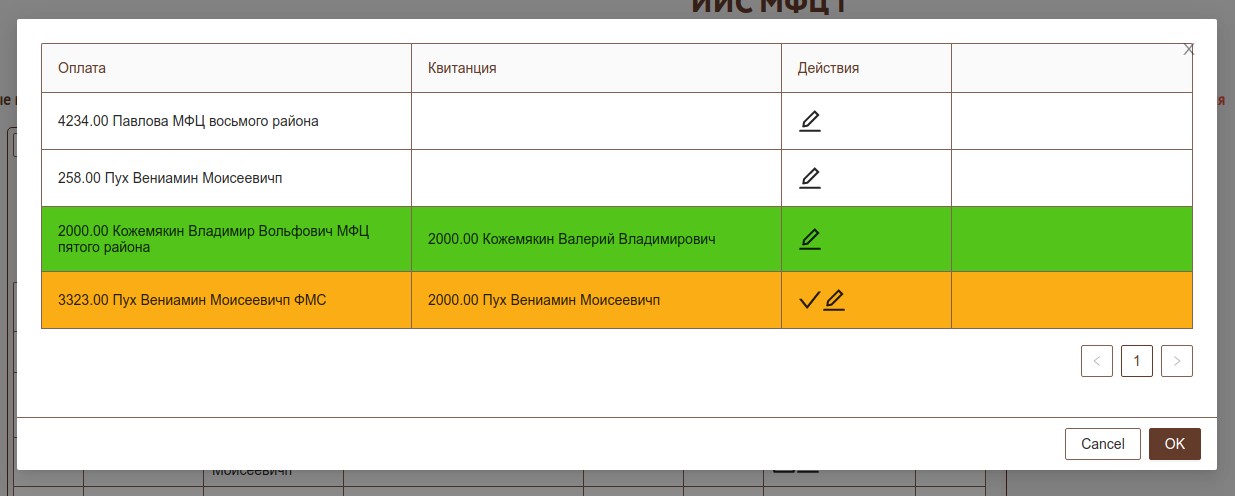 В форме сопоставления желтым выделены строки по которым для оплаты найдена подходящая квитанция, оператору нужно нажать на кнопку "сохранить" для утверждения связи. Зеленым цветом подсвечены строки в которых уже связь оплаты и квитанции установлена и подтверждение не требуется. Если подходящая квитанция не найдена, то строка в фоме будет белого цвета и оператор должен вручную указать нужную квитанцию, для этого нужно нажать кнопку "редактировать" после этого в колонке "квитанция" появится выпадающий список с возможными квитанциями(неоплаченные в которых получателем выступает организация из группы МФЦ). После выбора нужной нужно нажать "сохранить" для утверждения связи.