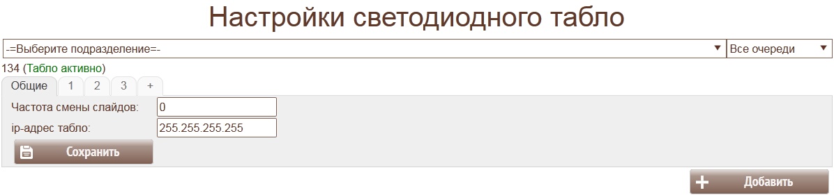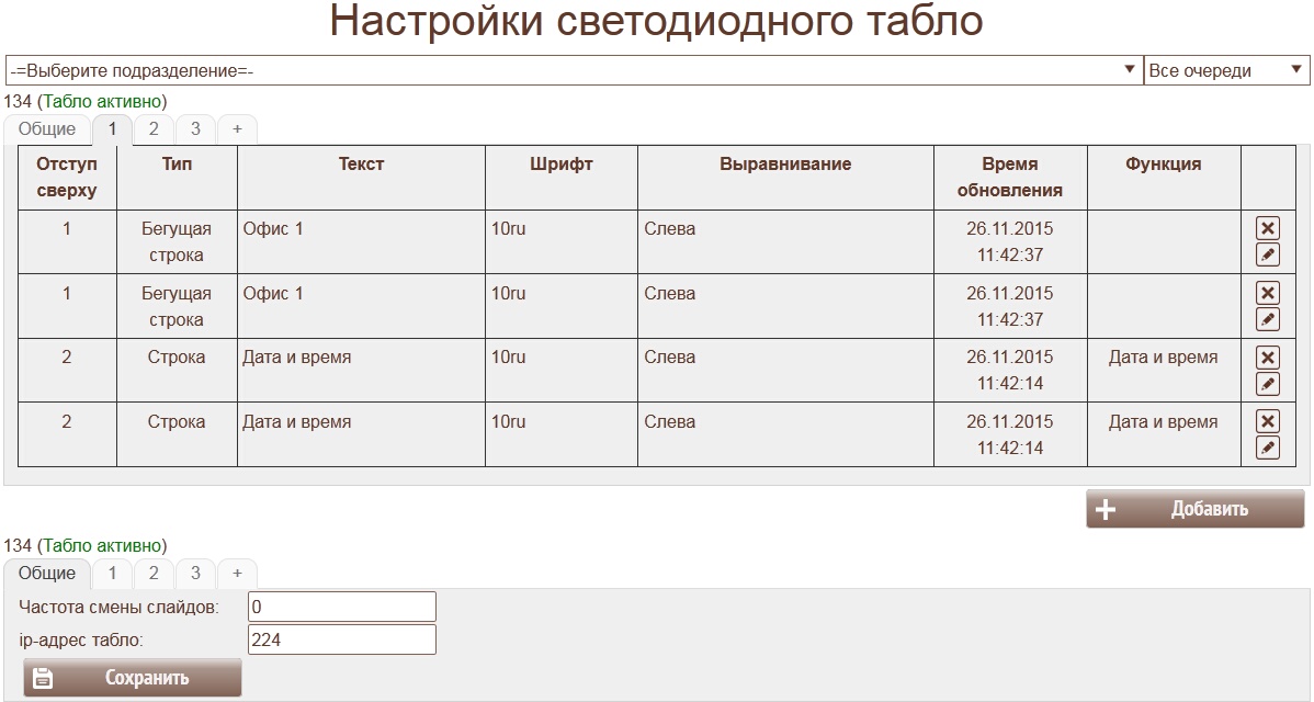 Для настройки модуля необходимо настроить отображаемые строки на табло Настройки-> Настройки очереди и киоска-> Светодиодное табло