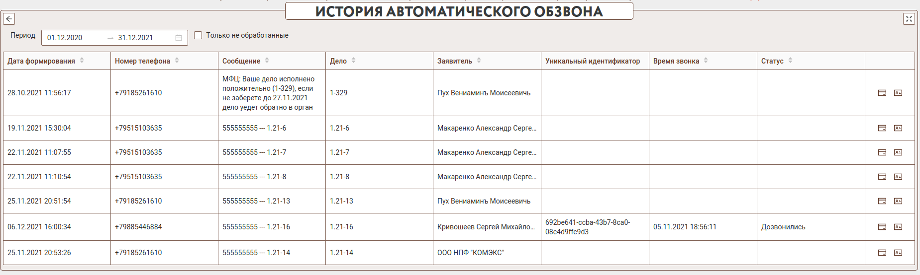 В списке будет отображаться номер телефона и сообщение, которое было отправлено в call-центр. Когда call-центр отчитается об изменение статуса будут заполнены колонки время звонка и статус.