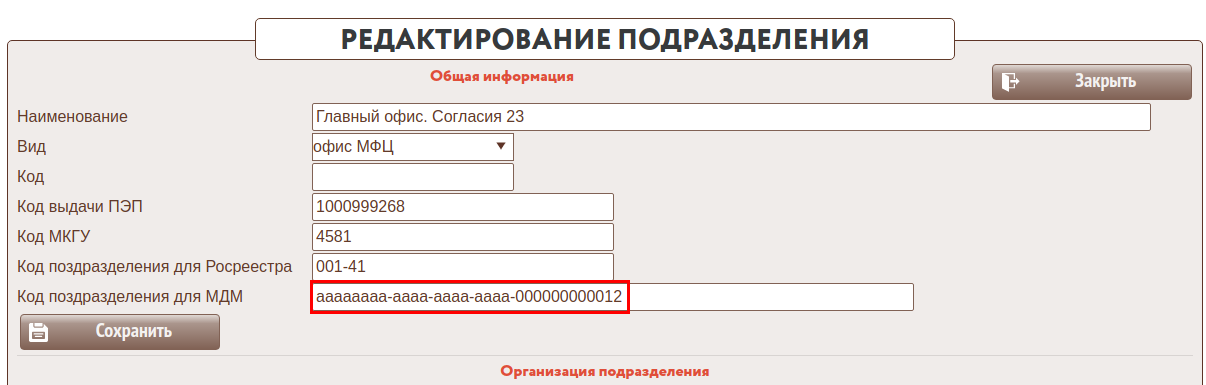 Для каждого офиса и ТОСПа МФЦ заполнить (Настройки -->Структура МФЦ) Код подразделения для МДМ, выданный при регистрации МФЦ