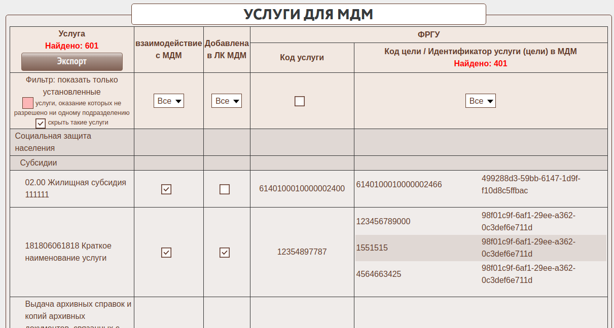 Необходимо для каждой цели услуги проставить код, с которым услуга+цель зарегистрированы в МДМ. Ранее этот параметр определялся на услуге, однако для услуг с несколькими целями МДМ требует детализации по целям.