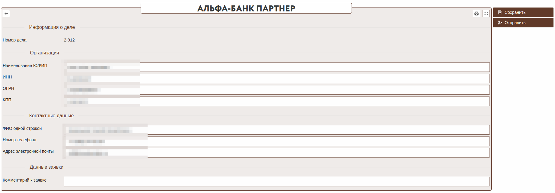 На услуге необходимо указать модуль Альфа Банк партнер. При создании дела будет показана кнопка, позволяющая перейти в модуль для отправления анкеты в банк.