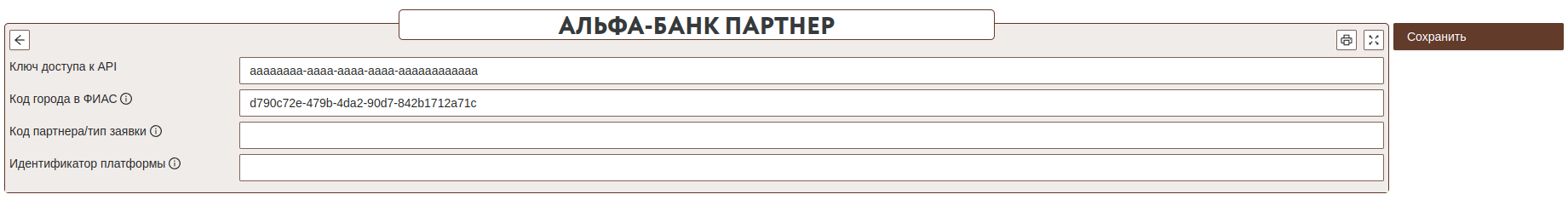 При необходимости можно указать значения для полей Код партнера/тип заявки и Идентификатор платформы. Данные поля не являются обязательными и указывать надо в соответствии с требованиями банка.