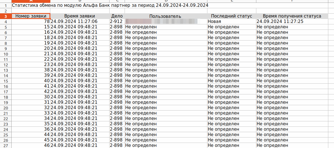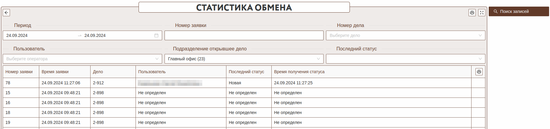Форма статистики обмена позволяет с учетом фильтров просмотреть информацию о заявках, которые были отправлены в банк.