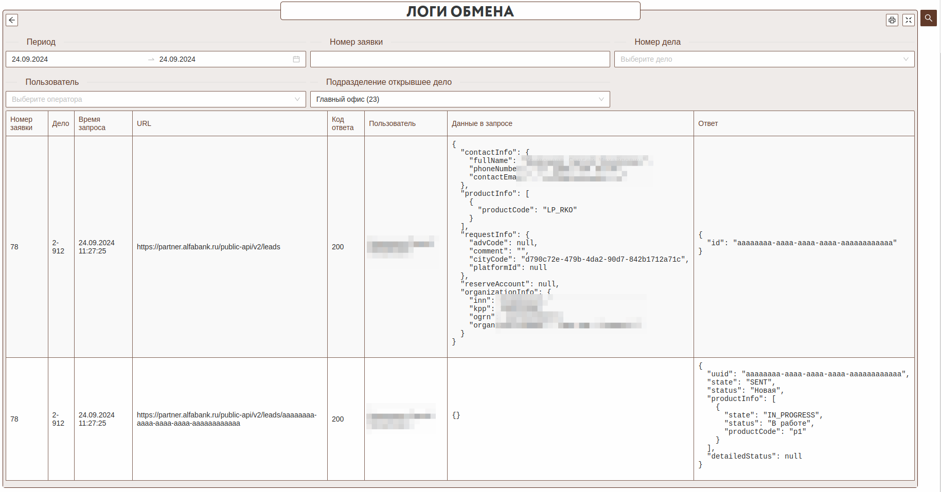 Форма с логами обмена позволяет смотреть какие запросы были отправлены на API банка с данными запроса и ответами от сервера.