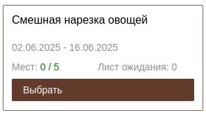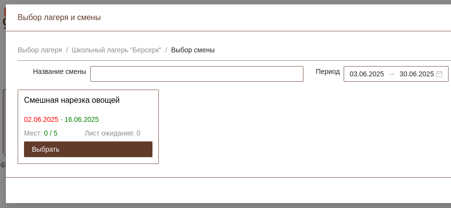 На карточке смены будет отображаться информация о ее названии, периоде количестве мест. Если все места заняты, то можно выбрать данную смену и анкета попадет в лист ожидания. В т.ч. на форме отображается информация о количестве уже добавленных людей в лист ожидания.