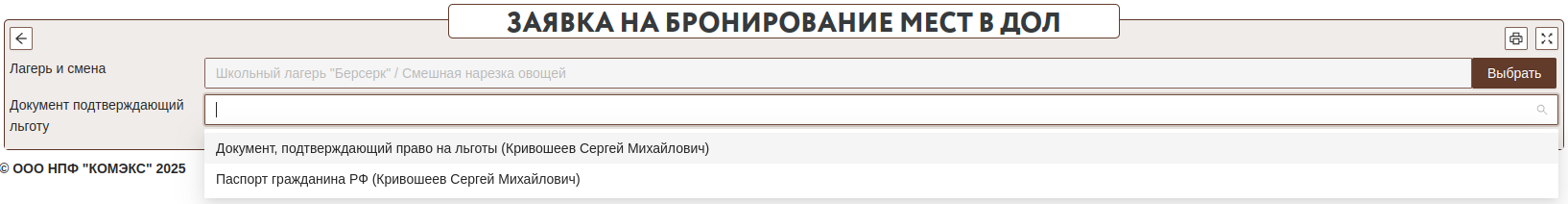 После выбора лагеря и смены можно указать документ подтверждающий льготу. Необходимо выбрать документ из списка документов в деле.